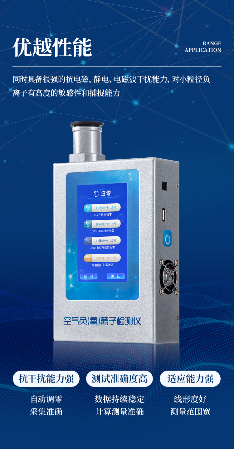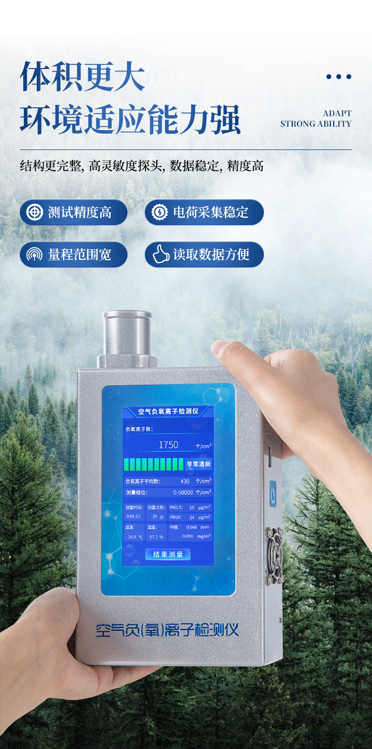 多功能負氧離子檢測儀是一款高精度、專業型空氣負離子、甲醛、pm2.5、pm10、空氣溫濕度檢測分析儀器。采用先進的圓筒電容結構負(氧)離子捕獲機制,將大氣中所含有負(氧)離子捕獲,然后通過獨有算法,進行精確統計計算。具備測量過程穩定,反應迅速,測量結果準確等優點。同時具備很強的抗電磁、靜電、電磁波干擾能力,對小粒徑負離子有極佳的敏感性和捕捉能力,整體性能優越。