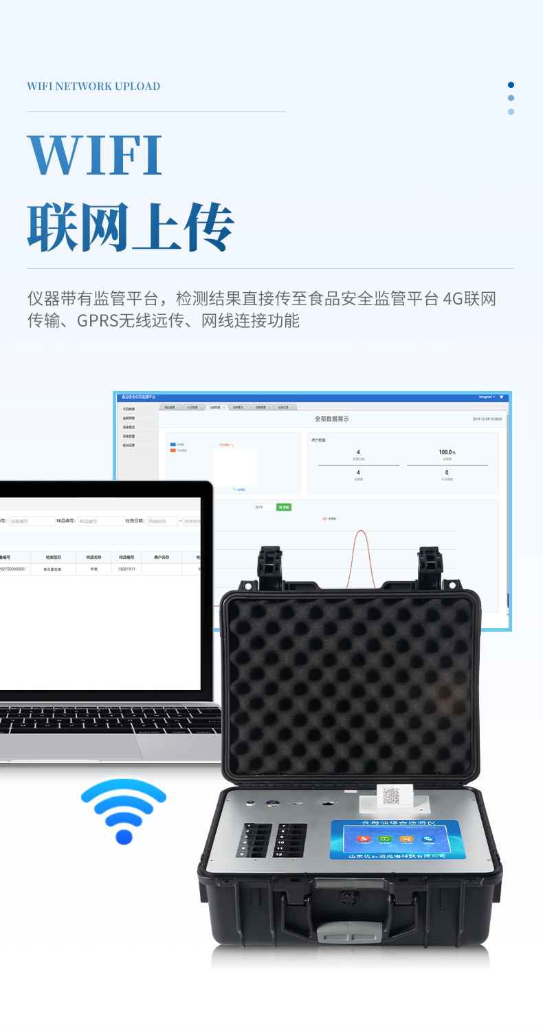 4、儀器帶有監管平臺,數據可局域網和互聯網數據上傳,檢測結果直接傳至食品安全監管平臺。進行區域食品安全監管及大數據分析處理與數據統計,檢測區域食品安全長短期動態,達到食品安全問題預估、預警