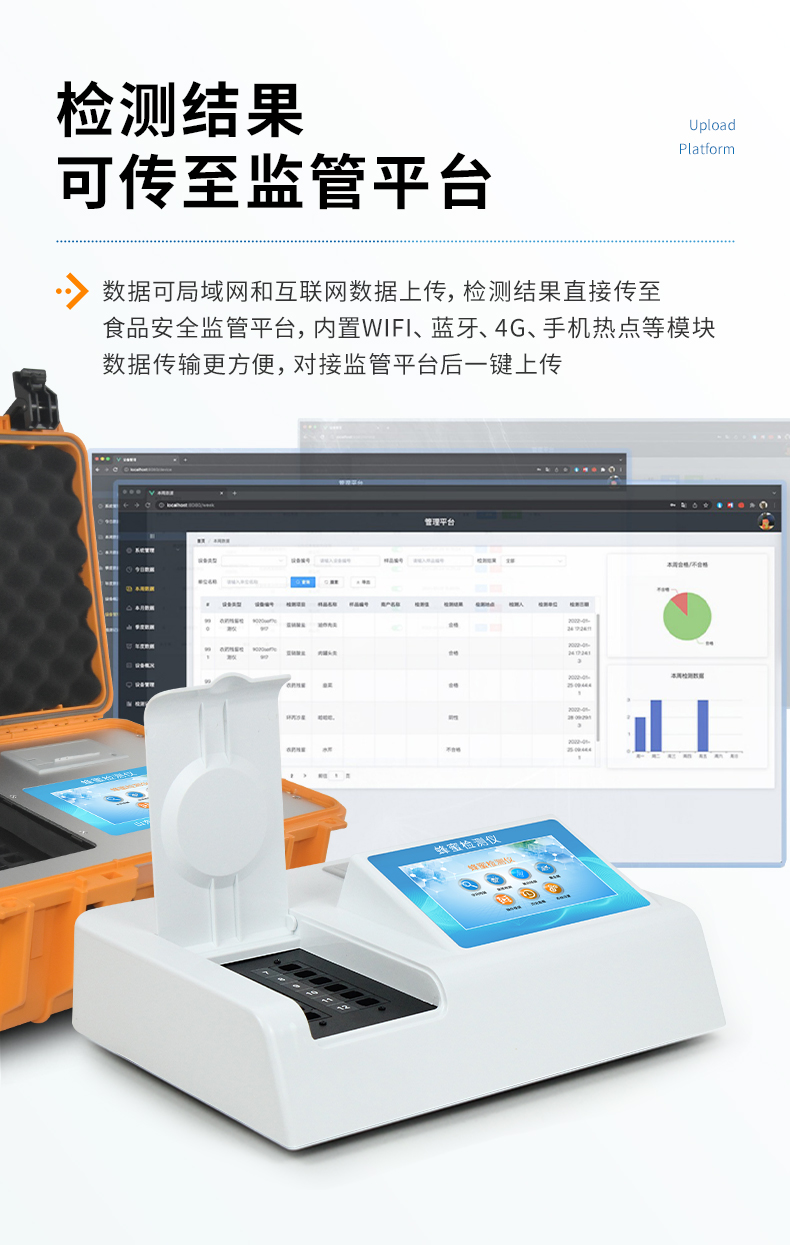 8、儀器帶有監管平臺。數據可局域網和互聯網數據上傳,檢測結果直接傳至食品安全監管平臺。進行區域食品安全監管及大數據分析處理,檢測區域食品安全長短期動態,達到食品安全問題預估、預警。