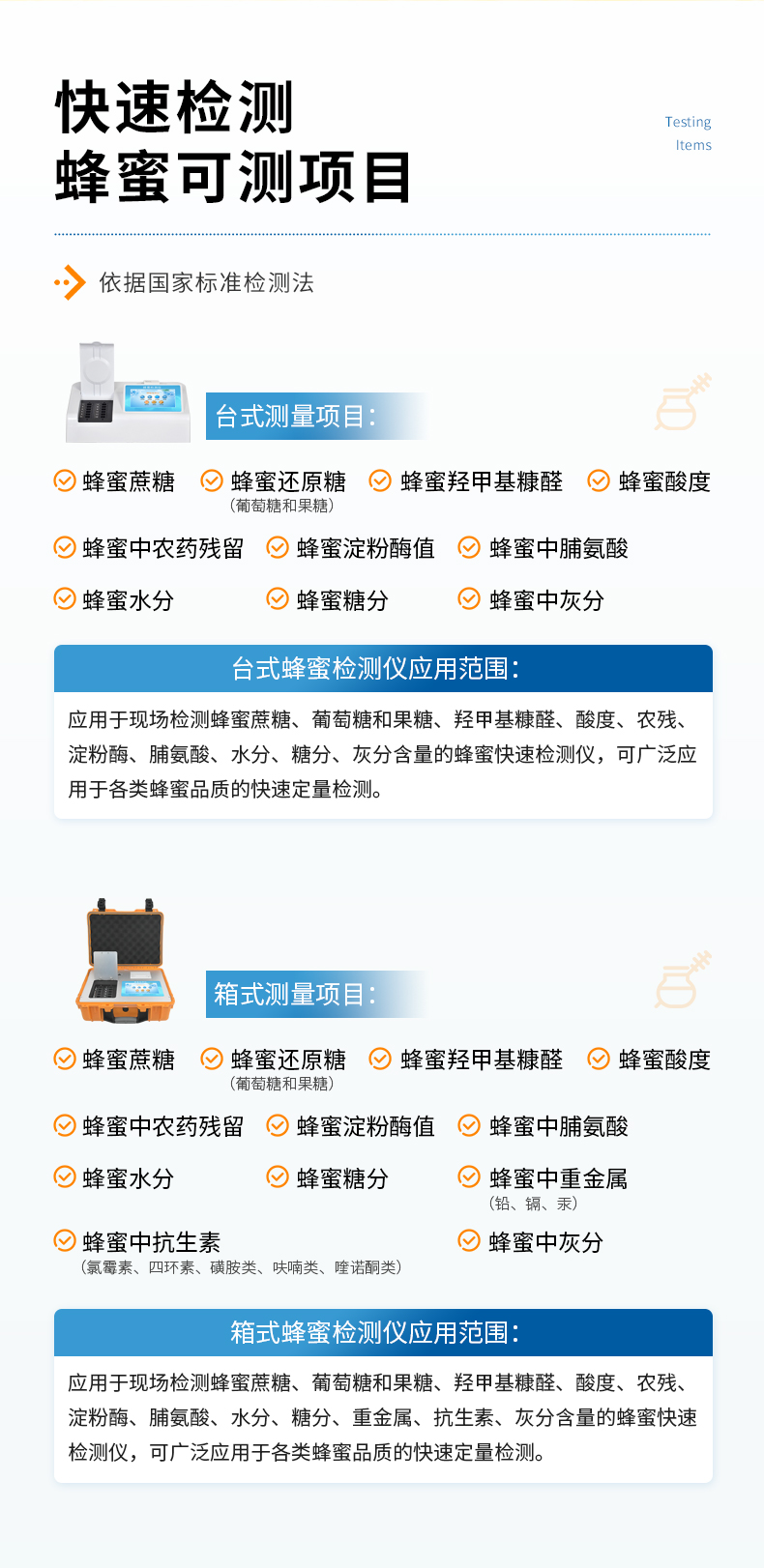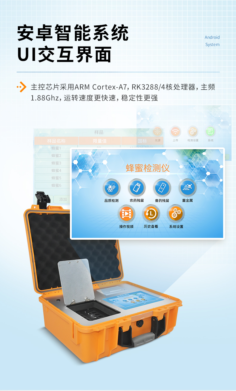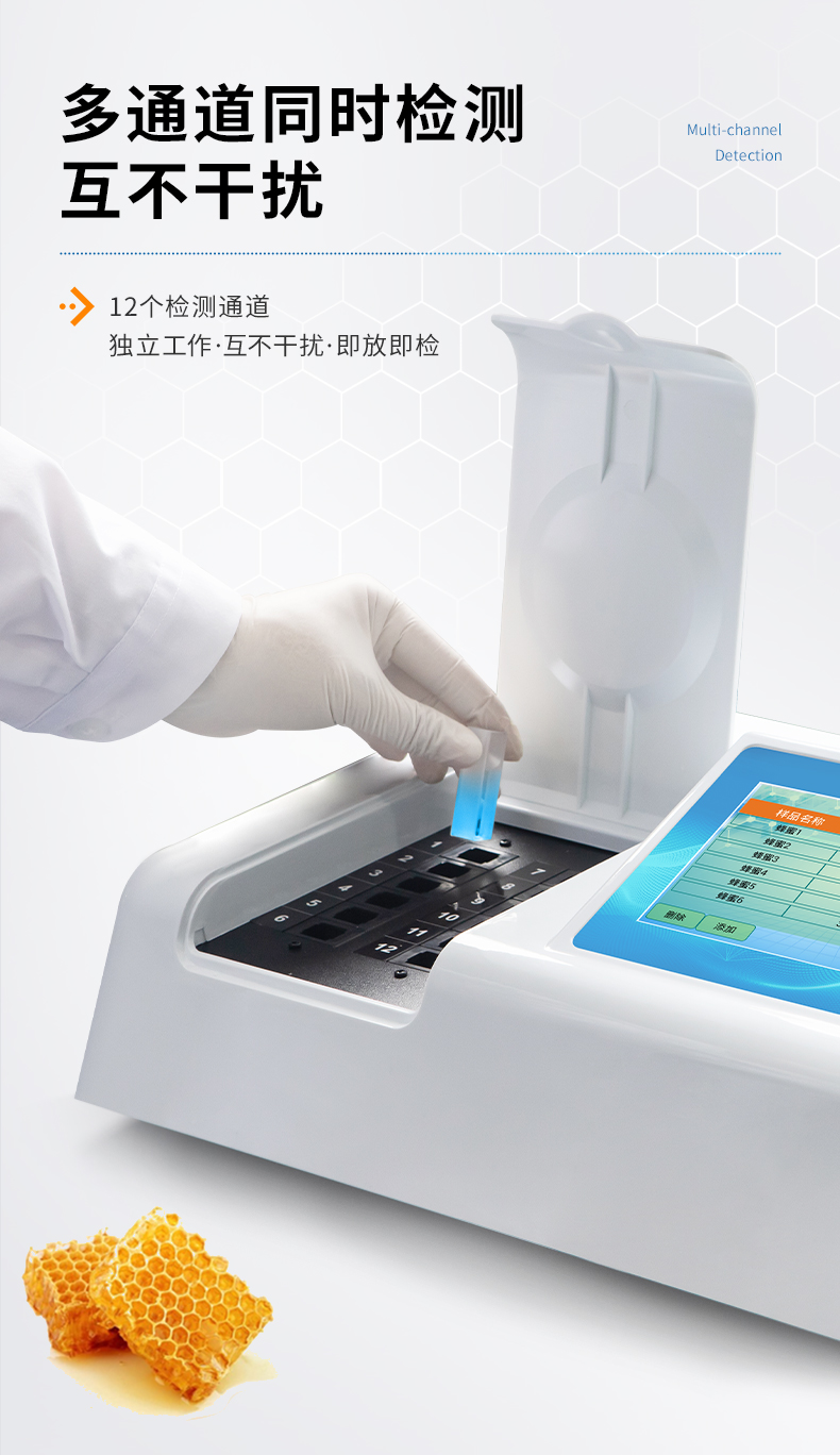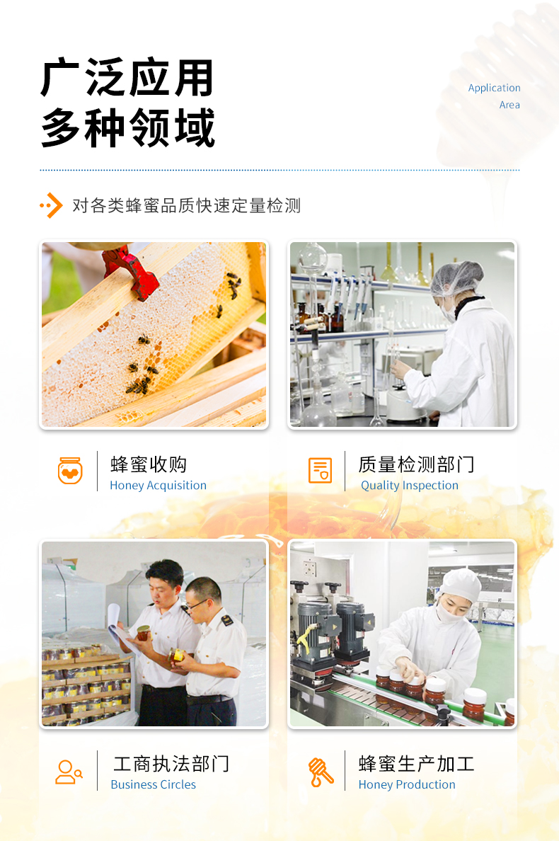 檢測項目:蜂蜜蔗糖、蜂蜜還原糖(葡萄糖和果糖)、蜂蜜羥甲基糠醛、蜂蜜酸度、蜂蜜中農藥殘留、蜂蜜淀粉酶值、蜂蜜中脯氨酸、蜂蜜水分、蜂蜜糖分、蜂蜜中灰分,應用范圍:應用于現場檢測蜂蜜蔗糖、葡萄糖和果糖、羥甲基糠醛、酸度、農殘、淀粉酶、脯氨酸、水分、糖分、灰分含量的蜂蜜快速檢測儀,可廣泛應用于各類蜂蜜品質的快速定量檢測。