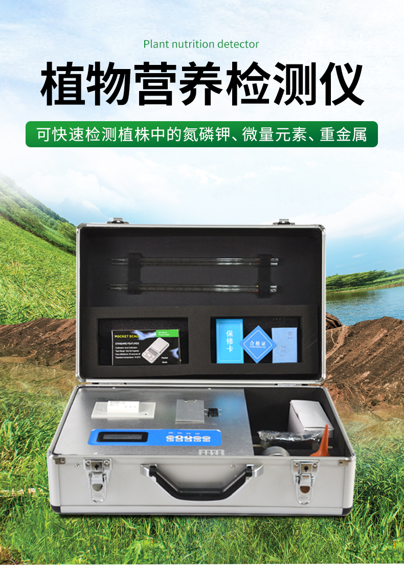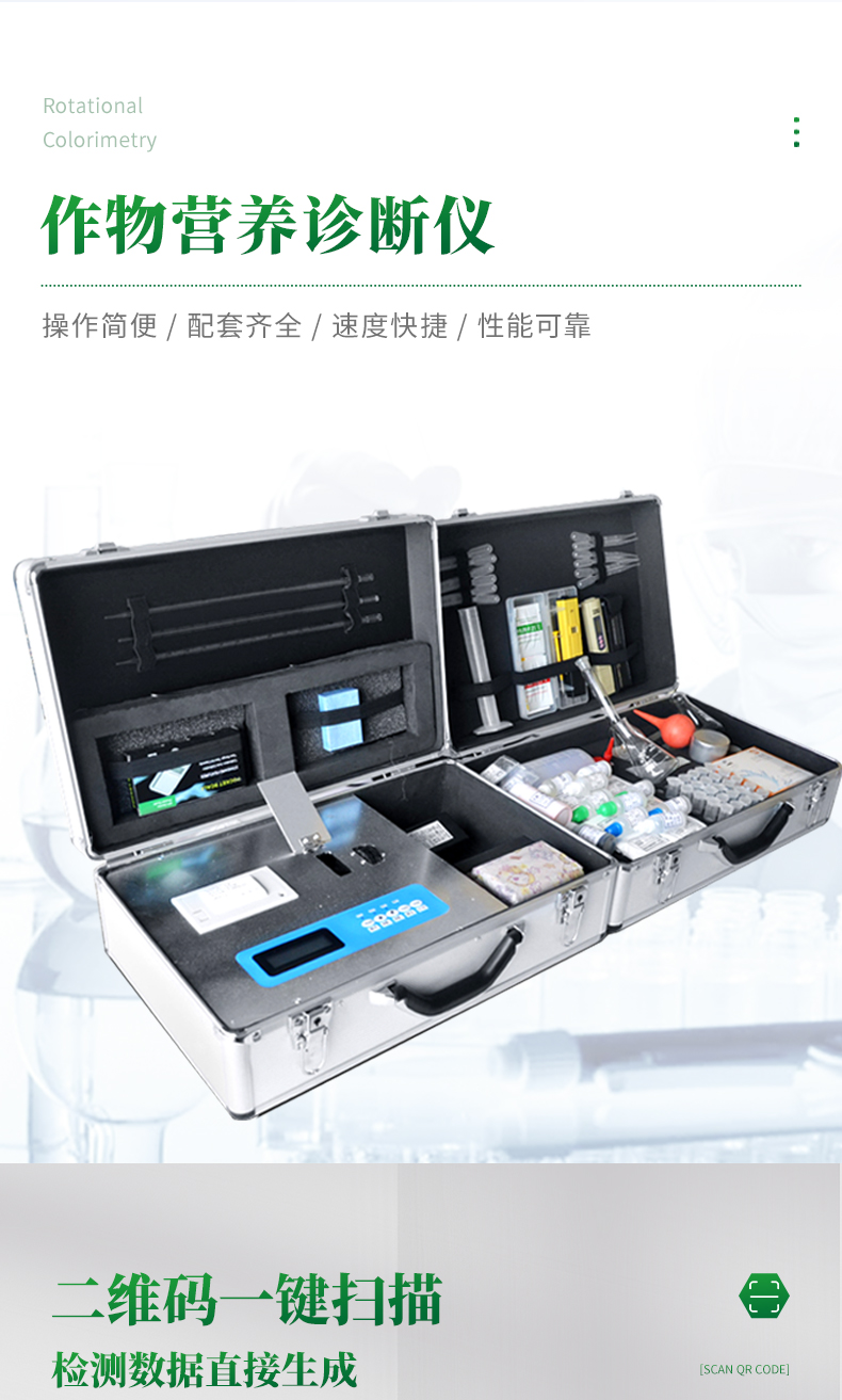 配套齊全:該儀器集藥、器、儀為一體,攜帶方便,相當(dāng)于一個(gè)小型實(shí)驗(yàn)室。適于農(nóng)業(yè)服務(wù)部門或農(nóng)資經(jīng)銷商、肥料廠商、莊家醫(yī)院進(jìn)行農(nóng)化服務(wù)。