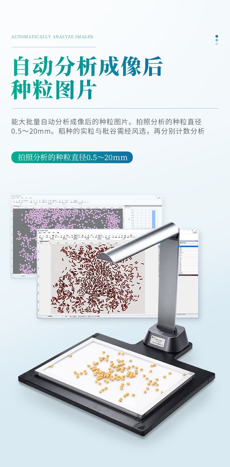 2、★能大批量自動分析成像后的種粒圖片。拍照分析的種粒直徑0.5~20mm。稻種的實粒與秕谷需經風選,再分別計數分析。