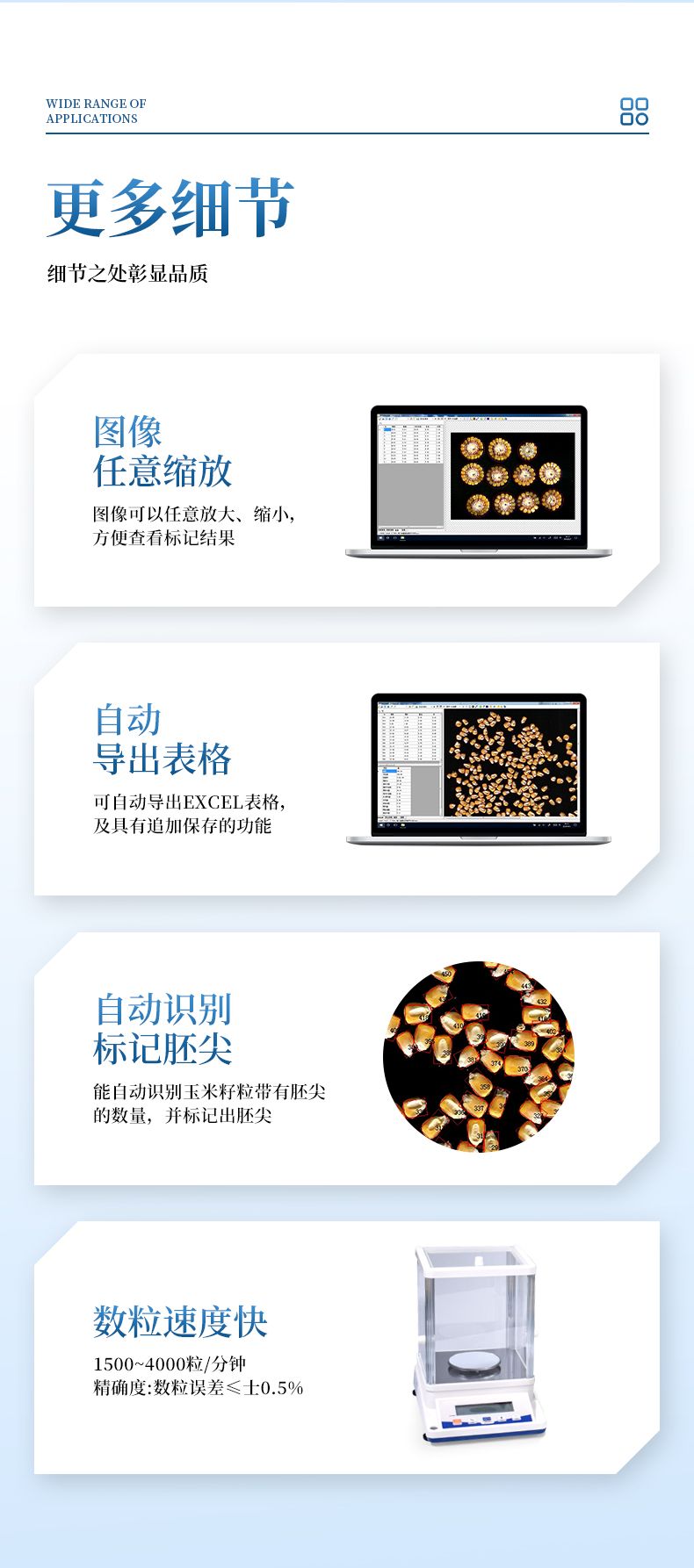 自動玉米考種分析及千粒重系統是根據圖像識別原理來實現自動分析的。可用于玉米實粒種子的精確考種、對玉米的籽粒、果穗、截面、出苗數、整齊度、均勻度分析。同時可兼做水稻、小麥、油菜、豆類、花生、芝麻等作物考種分析。