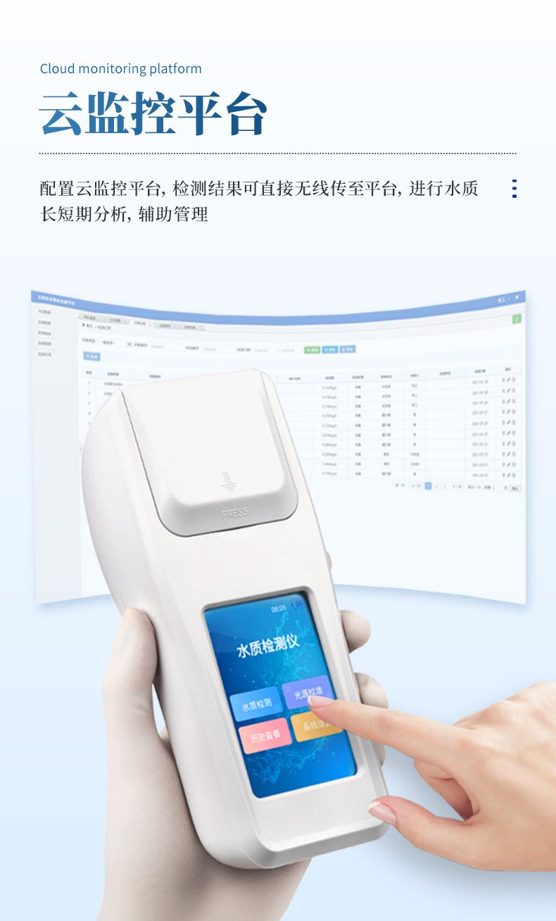 ②配置云監(jiān)控平臺,檢測結(jié)果可直接無線傳至平臺,進(jìn)行水質(zhì)長短期分析,輔助管理。