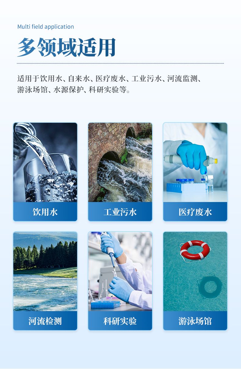 適用于飲用水、自來水、醫(yī)療廢水、工業(yè)污水、河流監(jiān)測、游泳場館、水源保護(hù)、科研實驗等。