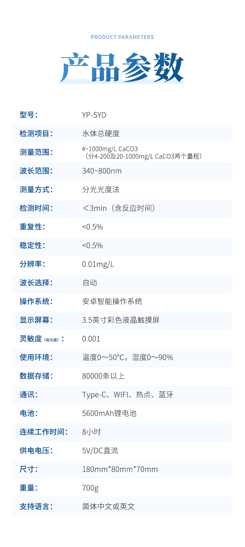 水質(zhì)總硬度檢測儀可簡單快速測試水質(zhì)中總硬度濃度值。利用比色法原理配合總硬度檢測試劑快速準(zhǔn)確測試水中總硬度含量。